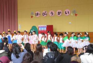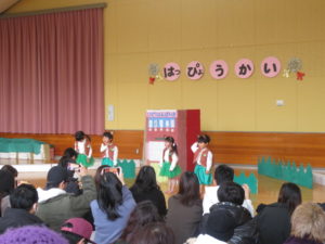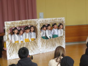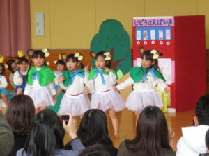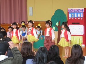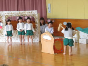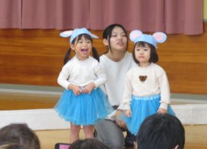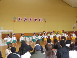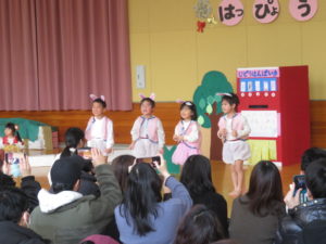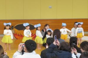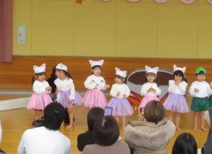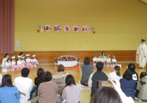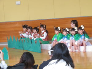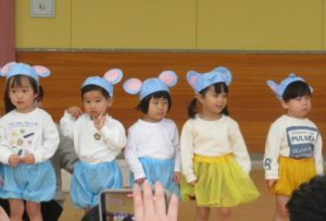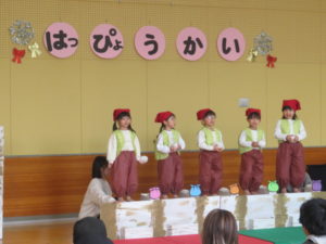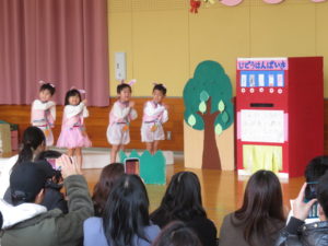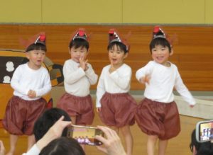 2月6日(木)3歳児みかん組、7日(金)2歳児もも組の発表会がありました。大好きなお家の方の前で少し照れたりびっくりしたりしていましたが、とても頑張っていましたね。