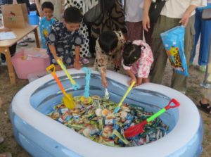 保護者会からは『おかしつかみ』のお店が出店しました。役員のお父さん方が準備をしてくださり、楽しむことができました。たくさんのお菓子の中からお目当てのお菓子が掴めると、大喜びの子ども達でした。暑い中参加していただきありがとうございました。