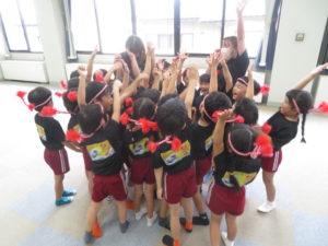 発表前はちょっぴり緊張していた子ども達でしたが、一人一人鉢巻を締めると、きりっとした表情になっていました。みんなで輪になり「がんばるぞ!エイエイオー」と掛け声をかけ、気合いを入れていた子ども達です。