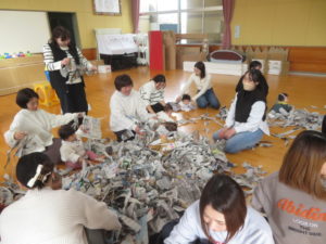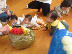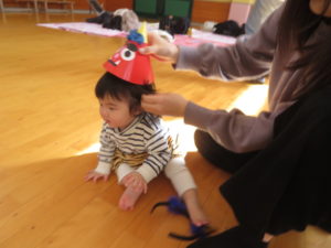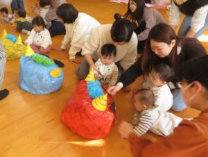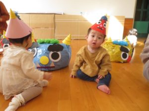 1月21日(水)蝶屋こども園 施設開放日に「新聞であそぼう!鬼さんをやっつけろ」をおこないました。たくさんの新聞を思い切りビリビリと破り、シャワーのようにかけたり、破った新聞の上をはいはいしたりして楽しみました。たくさん遊んだ後は、新聞をポリ袋に詰めると可愛い鬼さんの出来上がり!不思議そうに見つめながら近寄り、鬼さんにタッチして鬼のとんがり帽子をもらいました。